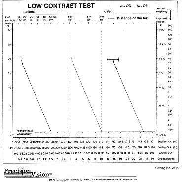 The visual acuity values at 2.5% contrast level are derived from the above picture. In it, at the high contrast level, are marked the present visual acuity values for severe low vision at 20/400 (0.05, 6/120) and for low vision 20/63 (0.32, 6/19). The declination of the slope is that of normally sighted individuals. Among persons who have visual acuity 20/16 (1.25, 6/4.8) and who see a few symbols on the next line, variation of visual acuity values at 2.5% is between 20/50 (0.4, 6/15) to 20/32 (0.63, 6/9.5). I have chosen the mean between these two values to be the point of the upper part of the descending slope. Among people who have low vision, the variation at low contrast is much greater. The point that we get by using the curve of the normally sighted individuals might be as fair as are our present values at high contrast. |
