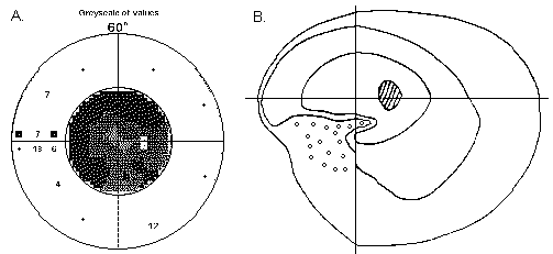 seems to be marked, yet in Goldman perimetry (B.) the area of lower left scotoma is