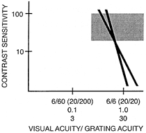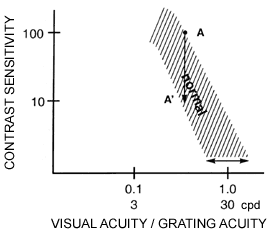 O intervalo de variação da acuidade visual normal (seta horizontal) e da sensibilidade ao contraste (seta vertical) é grande. Se a sensibilidade ao contraste de uma pessoa era anteriormente A e diminuiu depois para A’, o valor ainda pertence ao intervalo normal mas é altamente patológico para esta pessoa. Uma alteração na sensibilidade ao contraste é a característica importante que será futuramente monitorizada em termos de diagnóstico. Devido às grandes variações nos valores normais, é indispensável ter um valor anterior com que comparar de modo a detectar uma alteração. Idealmente, a sensibilidade ao contraste e a acuidade visual devem ser medidas quando as crianças terminam a escola secundária ou enquanto são jovens adultos. Estes valores devem ser registados e guardados como parte da informação básica sobre a saúde de cada pessoa. Uma alteração requer que sejam efectuados exames para descobrir a causa. Apesar da causa mais comum ser uma pequena alteração no poder refractivo do olho, que é um achado benigno, a repetição das medições da sensibilidade ao contraste seria benéfica, como parte de exames de saúde de rotina, para despistar alterações nas vias visuais. Medir a sensibilidade ao contraste também ajuda a perceber melhor as queixas, de uma pessoa cuja acuidade visual com alto contraste não se alterou, mas em quem a visão, com baixos níveis de contraste, diminuiu. Assim não a aborreceríamos ao dizer-lhe que a sua visão está tão boa como antes, uma situação que, neste momento, é vivida por muitos doentes/clientes.
