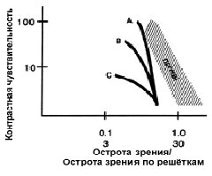 Способность человека к восприятию разных форм определяется не только остротой зрения. На представленном ниже графике изображена ситуация, при которой острота зрения у всех трех человек одинакова – 0.3. Однако низкие контрасты они различают совсем по-разному. Один из них воспринимает низко контрастные объекты нормально (А), у второго способность различать низкие контрасты до некоторой степени ухудшилась (В), а у третьего восприятие низких контрастов крайне ослабленное (С). Таким образом, из этих людей с одинаковой остротой зрения один видит нормально, второй слабовидящий, а третий - инвалид с тяжелым нарушением зрения. Кривая контрастной чувствительности показывает нам, что широкие линии (линии низкой пространственной частоты) видны при низком контрасте. Чтобы увидеть тонкие линии (линии высокой пространственной частоты), нужен высокий контраст. Вы можете воспользоваться Интернет – версией Руководства по контрастной чувствительности. Тесты для оценки зрительных функций у детей I Зрительные тесты I Инструкции I Главная страница |