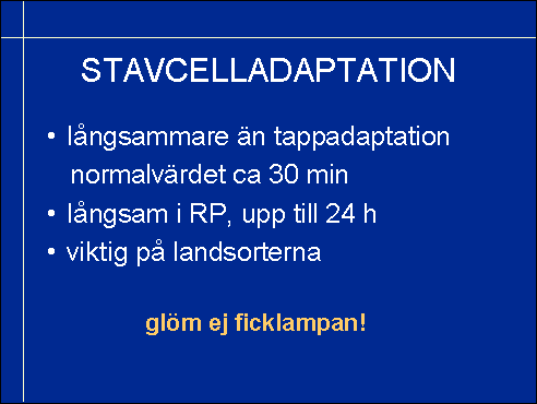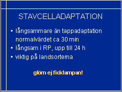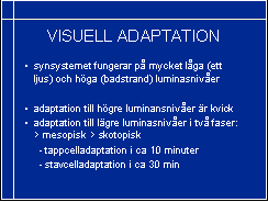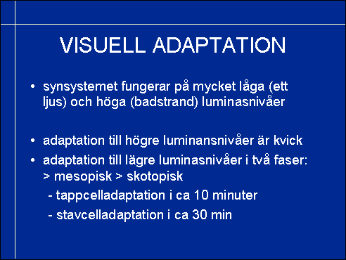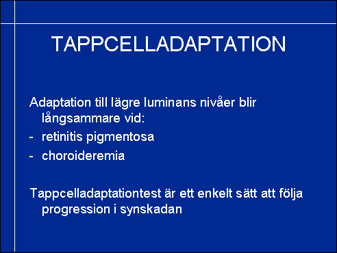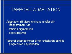 Visuell adaptation har två komponenter, tappcelladaptation och stavcelladaptation. Den förra är snabb, når till lågt mesopisk nivå i några sekunder och till maximum inom 10 minuter, den senare tar över en halv timme hos normalt seende. Tidigt i RP kan tappadaptatonstiden bli längre än normalt. Dess mätning kan därför användas för tidig diagnos av näthinnedegenerationer av vilka retinitis pigmentosa och choroideremia är de vanligaste i de nordiska länderna.