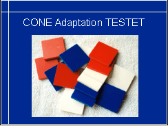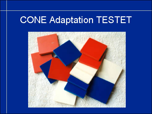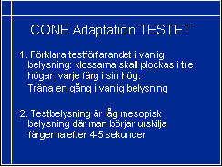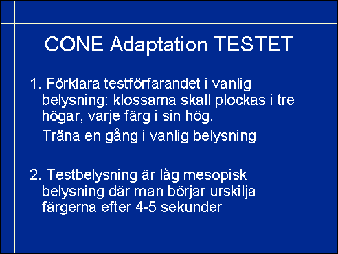 Testet tar mycket lite tid. Först får barnet sortera klossarna i vanlig belysning så man ser hur kvickt det går när barnet ser klossarna väl. Om handfunktionerna är tröga kan man göra testleken lättare och säga att högarna inte behöver vara fina torn utan klossarna skall sorteras på tre ställen på det mörka underlaget. När barnet kan sortera klossarna blandar man dem igen och säger till barnet att han/hon skall sortera klossarna en gång igen när takljusen har släkts och det har blivit rätt mörkt men inte helt mörkt. Den lågt mesopiska belysningen anordnar man före testsituationen, oftast så att man har en liten lampa på golvet i ett hörn. Belysningen skall vara så låg att det tar cirka fem sekunder för en normalt seende person att börja urskilja färgerna. De vita klossarna glöder i den låga belysningen så barnet börjar plocka dem. Då de är fem tar det nästan fem sekunder att sortera dem i en hög. Ett normal seende barn börjar då se färgerna och fortsätter leken till slut utan att tänka att den var ett test. Däremot ett barn som har lång adaptationstid måste sluta efter att ha plockat de vita klossarna och ofta säger att man inte kan se vilka klossar som är röda och vilka som är blåa. Man har gjort den här diagnostiskt viktiga observationen i några sekunder och testet har kostat nästan ingenting.