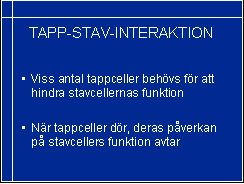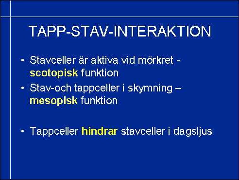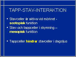 Bländning är en av de mest störande ändringar i seendet hos många barn med RP. För att förstå det måste vi veta något om interaktionen mellan stav- och tappceller. När belysningen är så låg att inga färger syns, beror synen på stavcellernas funktion. Funktionen är skotopiskt seende. När belysningen ökar så att färgerna blir synliga fungerar också tappcellerna och seendet är på det mesopiska området. När belysningen ökar till klar dagsljusnivå, fungerar stavcellerna mycket litet. Tappcellernas ökande funktion inhiberar, hindrar, stavcellernas funktion i dagsljuset.