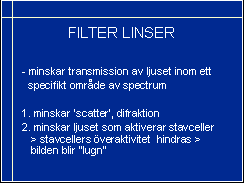 Filterglasögon minskar transmission av en specifik del av spectrum. Om man filtrerar bort den blå ända av spectrum nästan helt, är belysningen optimal till stavcellernas funktion samtidigt som de grön- och rödkänsliga tappcellerna får normal dagsljusnivå belysning. De blå tapparna adapterar sin funktion till lägre belyssningsnivån så de blå tonerna börjar synas så småningom. I några filterglasögon är den blå ändan så totalt absorberad att himlen syns grå, vilket är rätt deprimerande.