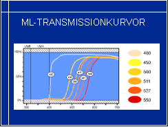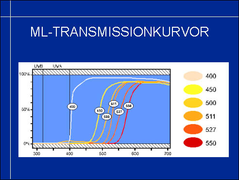 Som ett exempel på olika filterglasögon har vi här transmissionskurvor av Multilens filtrar som är de mest använda i Sverige. De filtrar som oftast används av barn med RP är filter 511, 527 och 550 som alla tre effektivt absorberar inom stavcellers absorptionsområde.