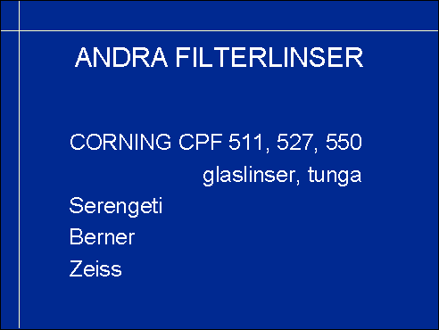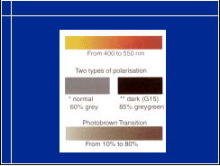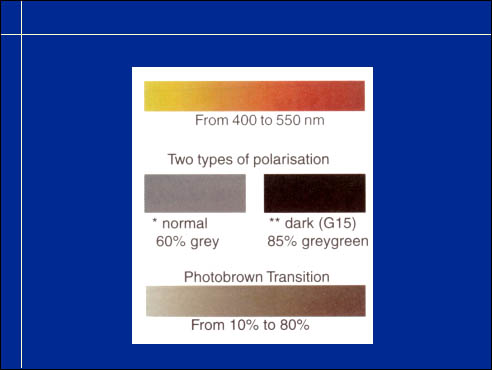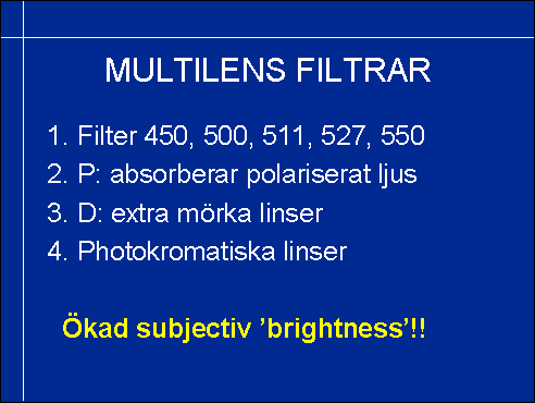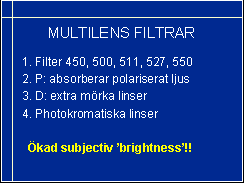 Multilens-filter har ett egenskap som gör dem mycket populära bland ungdomar: de kan kombineras med en annan filter som absorberar polariserat ljus. Då försvinner ljuset som reflekteras av vattenytor och andra glänsande ytor och samtidigt blir filterglaset vackert brunt. Man kan välja mellan en ljusare och en mörkare filter för polariserat ljus. Filterlinser i dia 92 är på marssnö innan vi började testa dem vid ett skiläger för Usher barn. Alla filterlinser och vanliga absorptionslinser testas ute och hellst vid olika belysningar, klar solljus, halvmulet, tidigt på morgon och sent på eftermidddagen när solen är nere nära horisonten. Multilens har också vanliga fotokromatiska linser för personer som inte behöver filterlinser utan behöver minskning av belysningen genom hela spetrum.