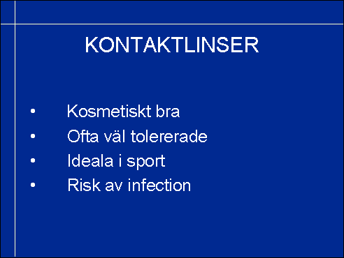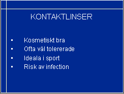 Filtereffekt kan man ha också i kontaktlinser som samtidigt som de ändrar ljusets struktur gör grå och ljusblå regnbåghinnor spännande bruna. Kontaktlinser är ideala för sport men rätt dyra och fordrar bra vård och hygien, annars kan man få hornhinneinfektioner.