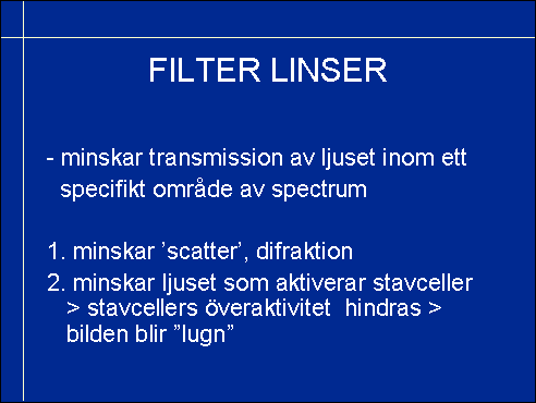 Då det finns tre olika filteregenskaper och två olika filtrar för absorption av polariserat ljus är urvalet nio olika filtrar för barn med RP. Det finns inte en filter som skulle vara bäst utan behovet varierar från barn till barn. Till exempel, när vi testade filterglasögon vid ett skiläger för elva Usher barn, valde barnen sina filterglasögon så att alla utom den mörkaste 550 filtern användes. När filterglasögon låter stavceller fungera normalt eller nästan normalt i dagsljuset, är antalet fungerande sensoriska celler flerdubbelt jämfört med tappcellpopulationen. Detta leder till att världen blir ljusare även om en hel del av ljuset har absorberats med filtern. Var och en borde få uppleva detta för annars är det svårt att tro.