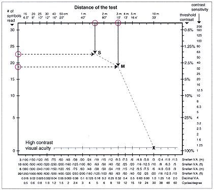 Bild 3. En person har sett 3 symboler rätt på den femte sidan (= 23 rätta svar) på 1.6m avstånd. Motsvarande punkt hittar man genom att dra en linje ner från 1.6m punkten och en annan linje från punkt 23 på vänstra sidan av diagrammet. Dessa linjer korsar vid punkt S. Andra punkten M motsvarar korsning av linjer 3m och 18 rätta svar. Linjen S-M-X är kontrastkänslighetskurvans lutande del.