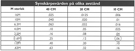 Bakom varje kort finns information om symbolstorlek som M-värdet. Det beskriver det avstånd på vilket bilden motsvarar synskärpevärdet 1.0.