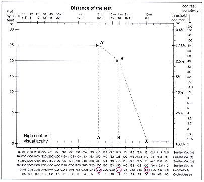 punkten som motsvarar synskärpa 0.2 = A och A' som motsvarar synskärpa 0.2 på 1.25% kontrast.