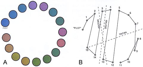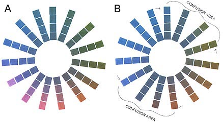 ![]() Bild.2. A. Färgytor i den här bilden representerar alla spektrala färger, saturerade i den yttersta delen av varje färgområde. B. Färgytor i 2A sådana som de ses av en person med deutan (grön) defekt. Gröna färgtoner och opponenta färgtoner i violett-rött område är svåra att urskilja och blandas lätt. Då konfusionerna är mellan motsatta färgområden i färgcirkeln finns det en 'axel' genom färgcirkeln. (Bilden reproduceras med tillstånd av Docent Anders Hedin) Farnsworth Panel-D15 och Panel 16 test är sorteringtest med 16 testfärger, den första av vilka, den s.k. "pilot'en", är fast i testet i Panel D-15 och en lös testknapp i Panel 16. Personer med defekter i färgseendet sorterar färgerna i en annan ordning än personer med normal färgseende. De ställer färger, som de ser lika, bredvid varandra (Bild 3A). När man då vänder färgknapparna och ritar linjen i färgcirkeln från en siffra till en annan i den ordning som siffrorna är på knapparna (Bild 3B), visar resultatet antalet konfusioner eller korsningar över färgcirkeln och mindre konfusioner mellan nära liggande färger.