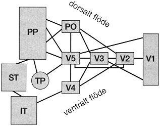 ![]() Bild 2. Mycket förenklad bild av synbanorna från den primära synbarken vidare till högre synfunktioner. I den primära synbarken och i de specifika områden som behandlar informationen vidare är vissa delar av bilden skilda från varandra. Det finns specifika cellgrupper för analys av linjernas riktning, vinkelstorlek, färg och rörelse och informationen går vidare till specifika små områden för vidare analys och sedan kombination och jämförelse med minnesbilder (Bild.2). Dessa specifika områden har normalt mycket effektiv koordination av funktionerna så att vi t.ex. ser färgen på objekten och inte bredvid dess form. Grupper av celler som är ansvariga för specifika analyser kan inte ersättas av andra cellgrupper om de blir skadade. Skadan kan drabba bara en enda cellgrupp, t.ex. den som analyserar ansiktsformen. Då kan barnet/personen inte känna igen ansikten och måste lära sig kompenserande strategier som att komma ihåg kläder, smycken, glasögon etc. och röster. Barn som inte har förmåga att känna igen ansikten och annars ser normalt är i fara att missförstås vara autistiska när de inte känner igen folk, ofta inte ens familjemedlemmar, och har därför avvikande beteende när de möter folk. Lika ofta missförstås de barn som inte ser ansiktsuttryck och därför inte utvecklar sociala färdigheter och kommunikation. Om formseendet drabbas men parietala synfunktioner fungerar normalt kan barnet/personen ha olika problem i formseendet men kan samtidigt lära känna samma problematiska former genom taktil och haptisk information och kan också gripa objekt med rätt avstånd mellan fingrarna innan handen rör vid objektet. Test för kognitiva synproblem utvecklades för tidig diagnos och kan användas som leksaker i dagvård och hemma lika väl som de används av neuropsykologer. Faktorer som inverkar på testsituationenVid observation och undersökning av en viss synfunktion måste man vara medveten om att andra avvikande funktioner kan störa den funktion som man observerar. I många testsituationer vid undersökning av spädbarn och barn på tidig utvecklingsnivå väntar man motorisk respons, en följerörelse eller en snabb saccad. För att barnet kan ha en sådan respons måste följande förutsättningar uppfyllas eller man måste ändra testtekniken: