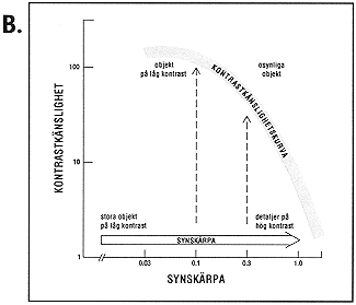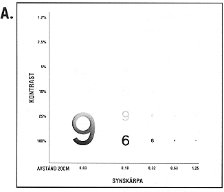 Bild 1. Kontrastkänslighetskurvan. Synskärpevärden är skrivna på den horisontala X-axeln och kontrasten eller kontrastkänsligheten på den vertikala Y-axeln. A. Bilderna blir mindre och mindre från vänster till höger motsvarande de bättre synskärpevärdena och har svagare och svagare kontrast när man går uppåt på bilden.